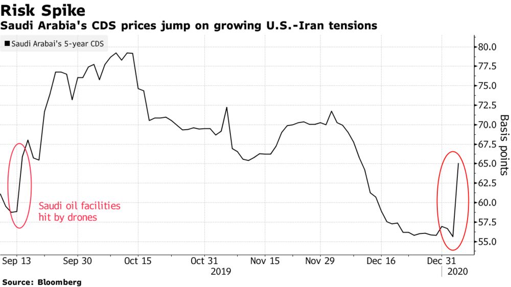サウジ債のデフォルトリスク急上昇 イラン司令官殺害受け チャート Bloomberg